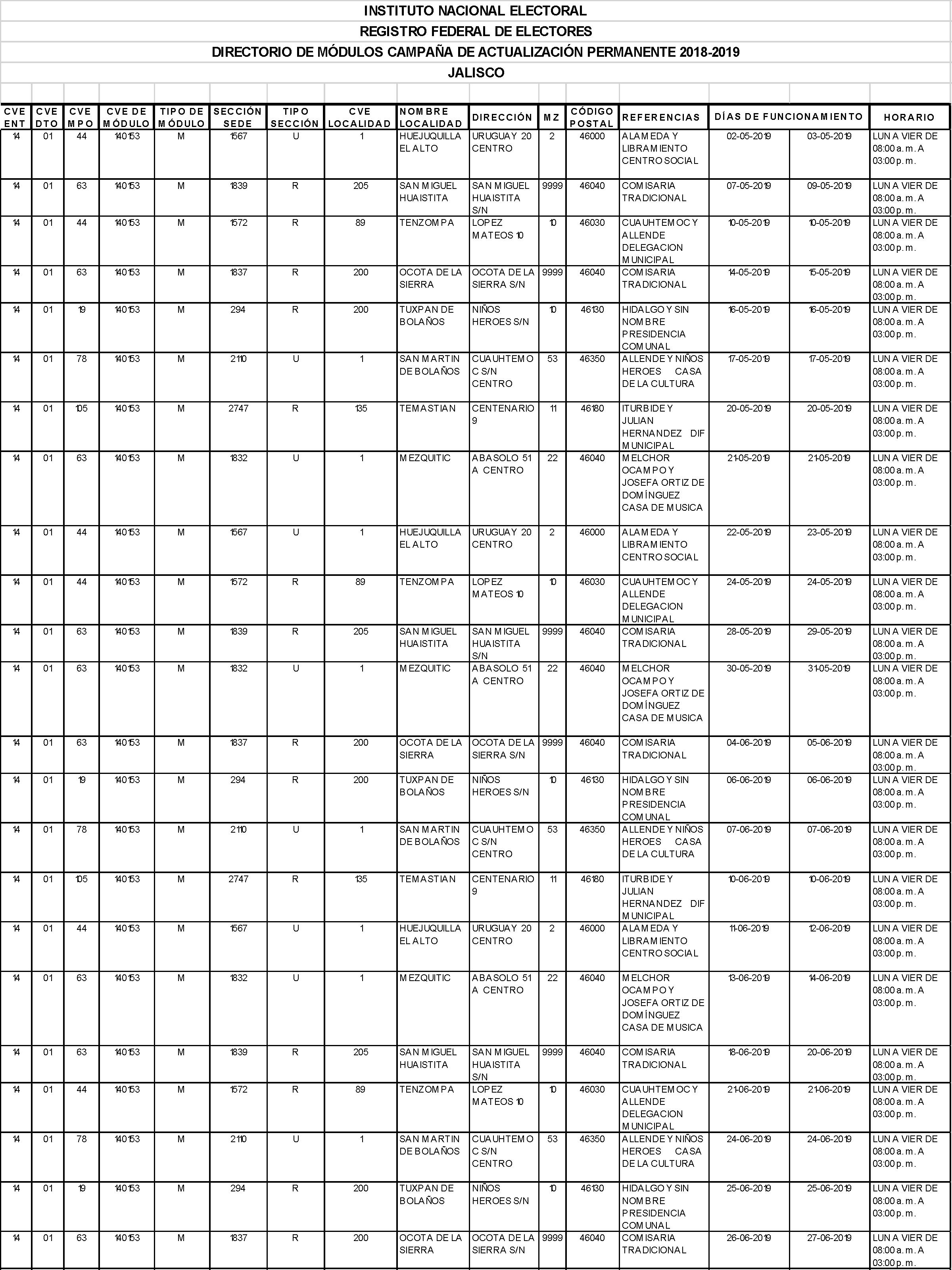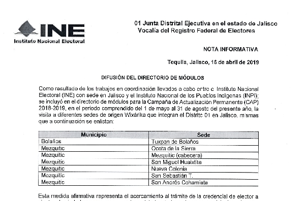 NORTE INE publica los módulos de la parte Wixárika del distrito 01 de Jalisco Voz del Norte 23 abril, 2019 Veces visto: 138